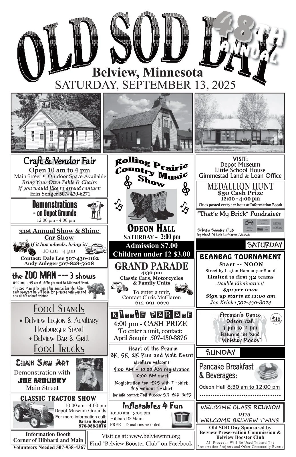 Old Sod Days - Sept. 13, 2025 Come home to Belview on Saturday, September 13, 2025 for our beloved Old Sod Days celebration and enjoy the Rolling Prairie Country Music Show, parade, entertainment for the kiddos, classic tractor and car shows, and so much more! View Complete Flyer Old Sod Days, Community EventsLaura HorejsiJuly 9, 2025 Facebook0 Twitter Pinterest0 0 Likes